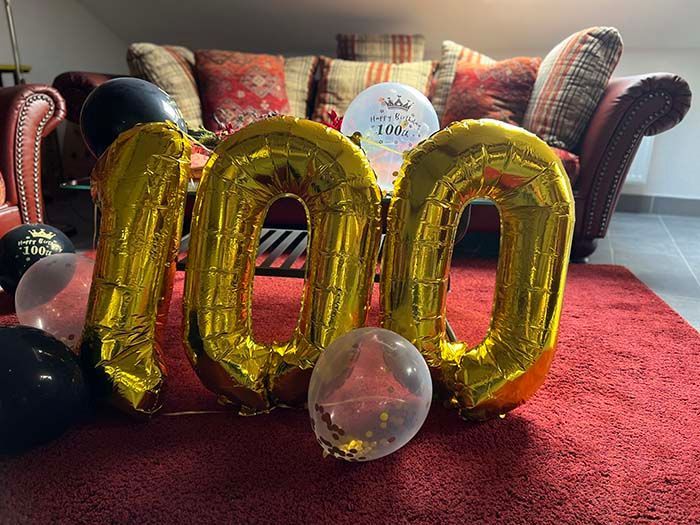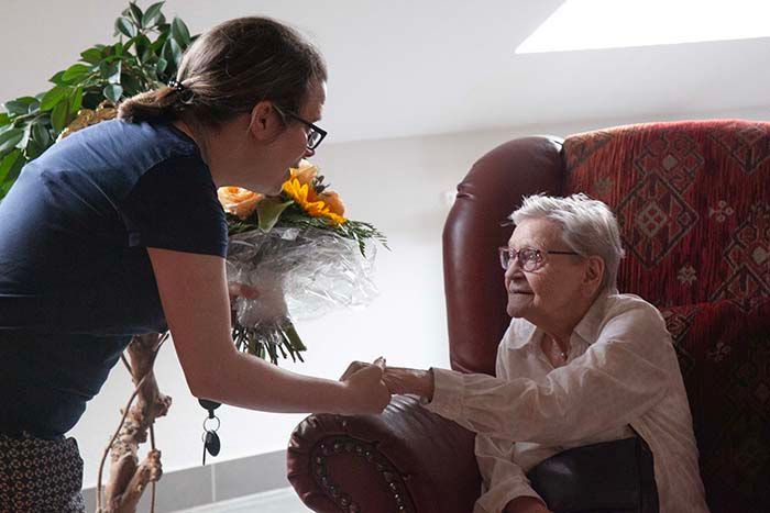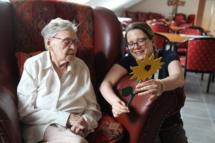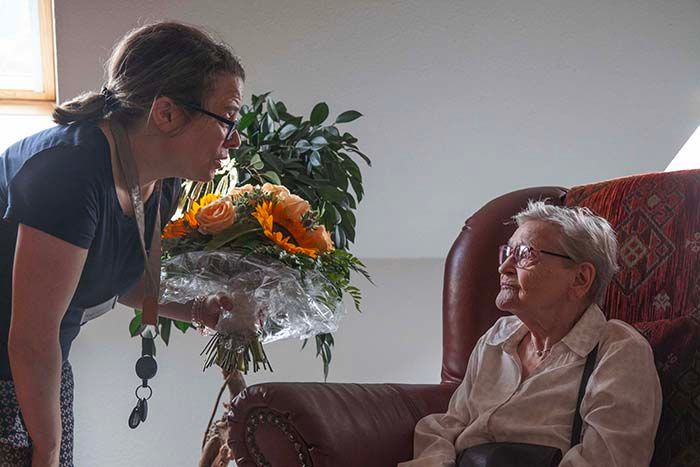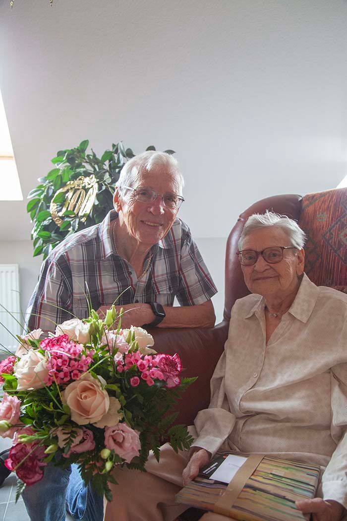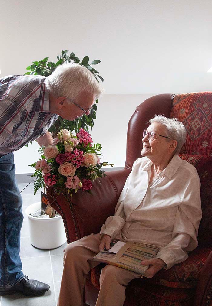 Natürlich durften zur Feier des Tages ein Gläschen Sekt bzw. O-Saft nicht fehlen, doch genauso herzlich freute sich die Jubilarin über Blumensträuße, liebe Worte und kleinere Präsente. So bekam sie nicht nur ein Bild mit allen Unterschriften der Bewohner und Mitarbeiter ihres Wohnbereiches geschenkt, auch ein Jahrbuch des Oberhausener Turnvereins durfte sie in Händen halten. Zu diesem Verein pflegte Ursula Alldieck über viele lange Jahre eine ganz besondere Beziehung. Einst hatte sie als Übungsleiterin erst Kinder und dann auch Frauen beim Turnen angeleitet, später unterstützte sie dann aktiv Senioren bei der Alltags-Gymnastik. Dass Sport bis ins hohe Alter fit hält, dafür ist unsere Jubilarin wohl das beste Beispiel. Bevor die Feierlichkeiten mit Familie, Freunden und Bekannten fortgesetzt wurden, schloss sich das gesamte Team des »Sozialen Ring Rhein-Ruhr« den lieben Grüßen ebenfalls an und wünscht Frau Alldieck auch auf diesem Weg alles Gute und weiterhin beste Gesundheit.