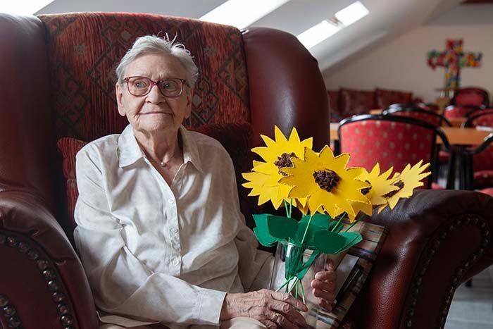 "Heute kann es regnen, stürmen oder schneien, denn du strahlst ja selber wie der Sonnenschein…“ - mit gleich zwei Strophen des bekannten Kinder- und Geburtstagslieds von Rolf Zuckowski überraschten einige Kinder der KiTa Sankt Michael am Freitagvormittag unsere Bewohnerin Ursula Alldieck. Auch waren Freunde und Bekannte gekommen, um ihr zu ihrem 100. Geburtstag zu gratulieren.