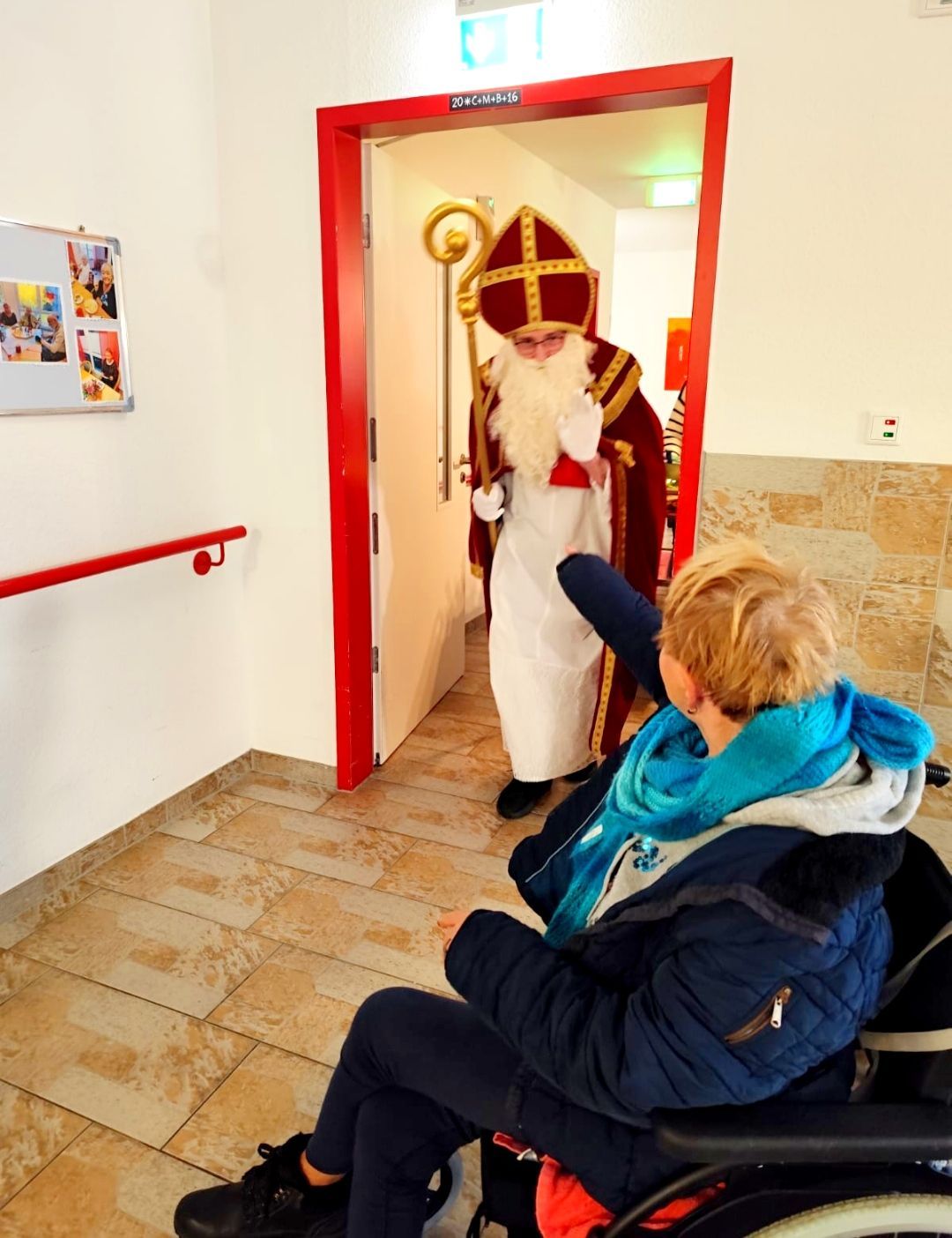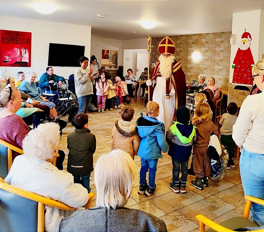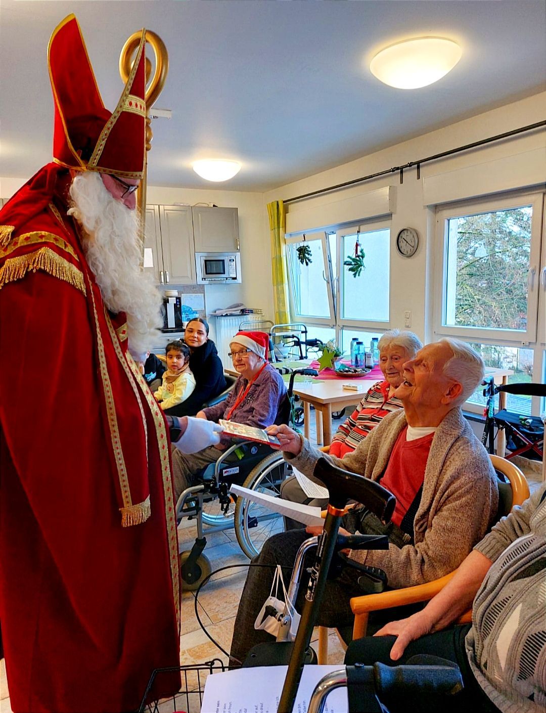 Nicht nur die Lichter im Christbaum glänzten, auch die Augen der Bewohner strahlten, als der Nikolaus den Wohnbereich betrat. „Wir pflegen eine enge Kooperation mit der KiTa Dellwig und haben die Kinder und die Erzieherinnen zu diesem Anlass in unser Haus einladen dürfen“, berichtet die Leiterin des Sozialen Dienstes Nadya Ayyaou. An diesem Tag wurde gesungen, auch wurden Gedichte vorgetragen. Der älteste Bewohner erhielt vom Nikolaus sogar eine persönliche Ansprache. Ein weiteres Highlight folgte am Schluss – jetzt wurden Süßigkeiten an die Bewohnerinnen und Bewohner sowie an die Kinder verteilt. Nun strahlten wirklich alle im weiten Rund.