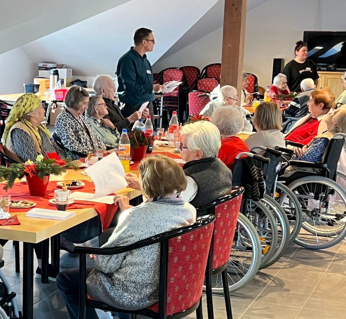 Die Weihnachtsfeier 2025 im »Haus Marienburg« war auch in diesem Jahr wieder ein wundervolles Highlight für unsere Bewohnerinnen und Bewohner. Der große Saal war gut gefüllt, als Angela Birkemeyer (Leiterin Sozialer Dienst) selbst kurz zum Mikrofon griff und gemeinsam mit ihrem Team und einem festlich zusammengestellten Programm startete.