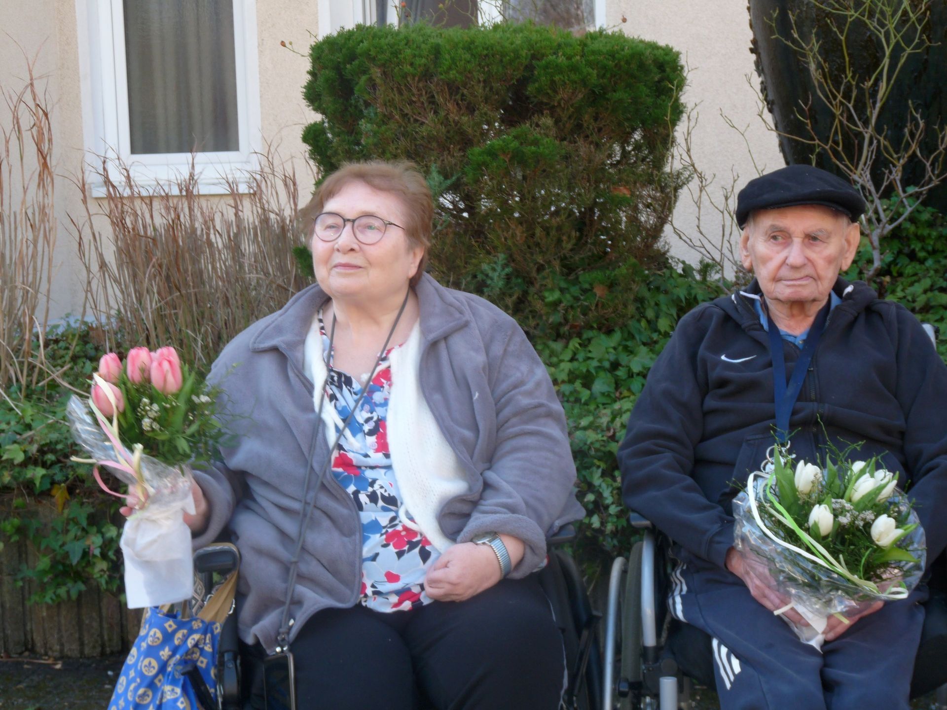 Pflegedienstleiterin Tatjana Schitschanin (links) und Carmen Ringelings (rechts) überreichten einen bunten Blumenstrauß und eine Ehrenurkunde.